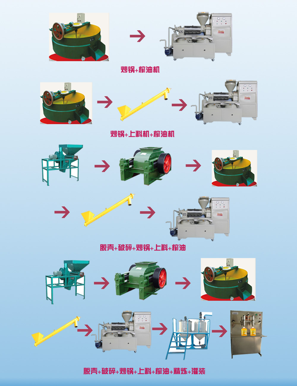 我廠生產的螺旋榨油機采用物理壓榨、適用于壓榨菜籽、大豆、花生、棉籽、葵花籽、桐籽等多種植物油料。具有投資少、配套簡單、易于維修、適應性強、出油效率高等優(yōu)點。對于中、小油廠和鄉(xiāng)鎮(zhèn)個體企業(yè)都很適用。