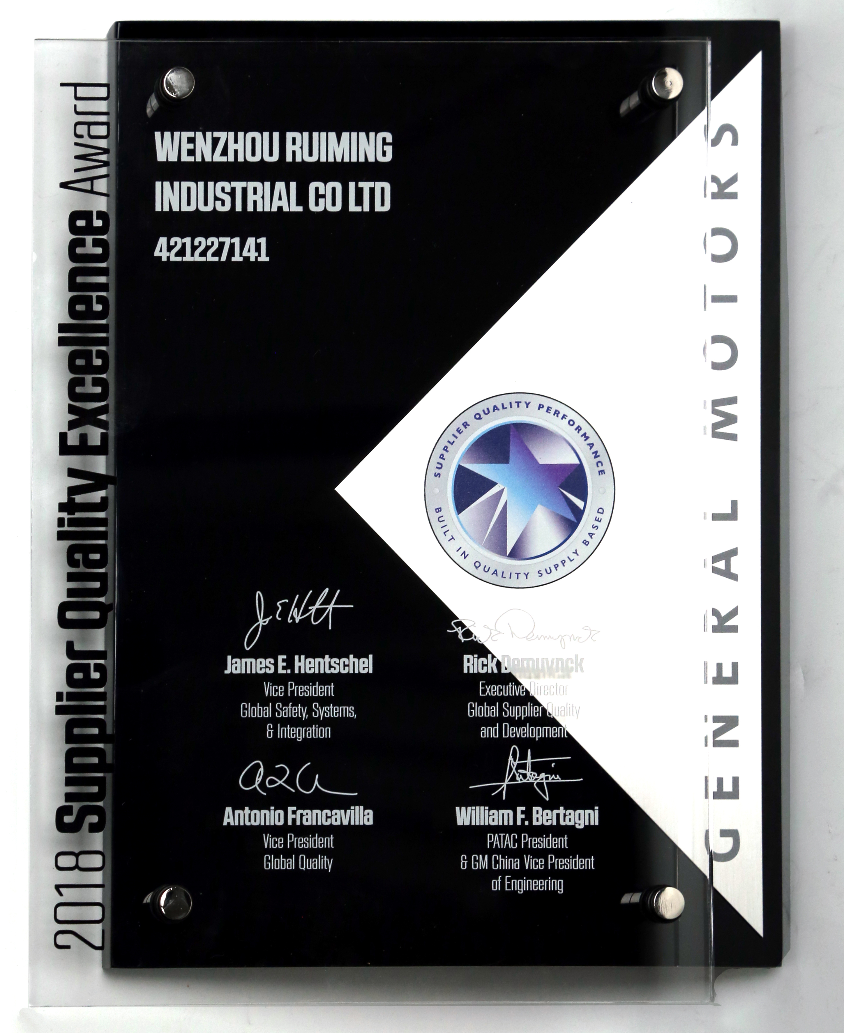 日前,溫州瑞明榮膺美國通用汽車(以下簡稱“GM”)2018 年度“全球供應(yīng)商質(zhì)量表現(xiàn)優(yōu)秀獎”,這也是瑞明第二次獲此殊榮。GM多次授予瑞明該獎項,體現(xiàn)了瑞明與GM之間長期穩(wěn)定的合作關(guān)系,也是客戶對瑞明全方位的供貨與服務(wù)能力的認(rèn)可。